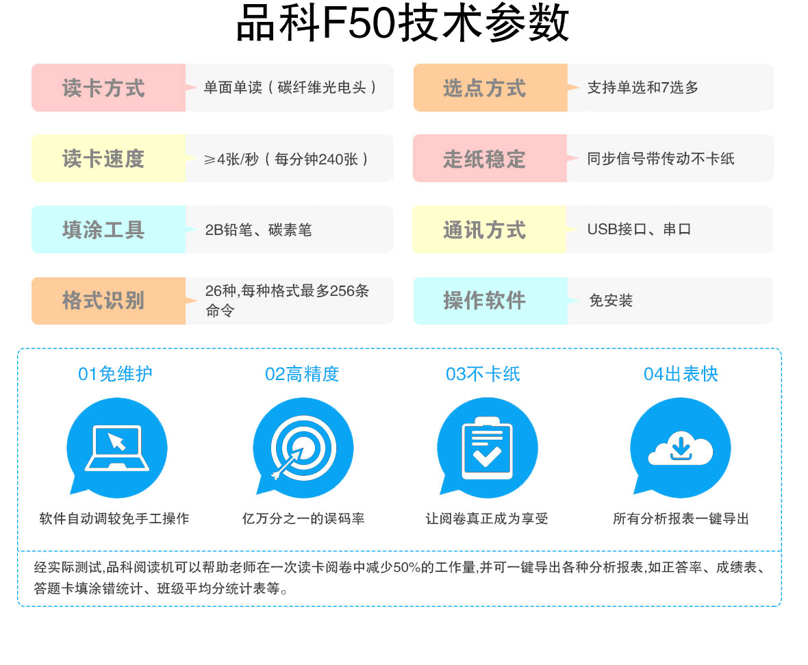 光標閱卷機F50支持單選和七選多,軟件自動調整校對免去手工操作,讀卡速度大于4張/秒