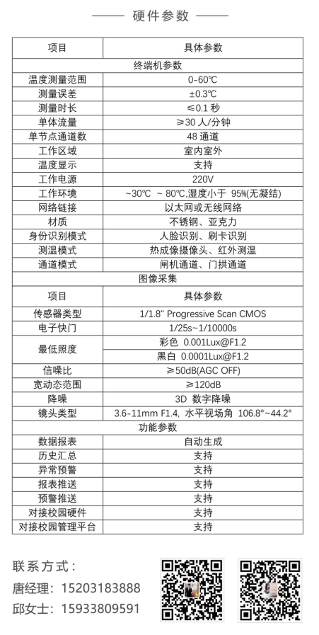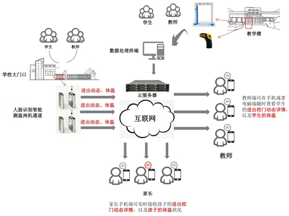 本系統主要以師生體溫為主要參照物,實現疑似患者的快速篩查,并與小優智校實施聯動,實現數據的及時上傳、推送,防止病毒大面積傳播。在校園內實施多位置,多渠道,多次數的綜合體溫測量方案,與小優智校服務平臺配套部署,可實現針對傳染類疾病患者的早發現、早報告,早治療,為校方啟動應急預案,積極應對,提供大規模的基礎數據,爭取更多有效時間。